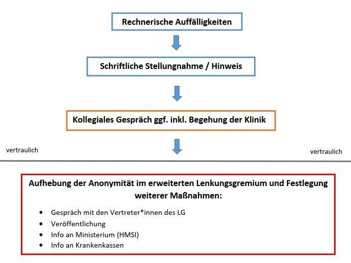 Bei Abteilungen mit rechnerisch auffälligen Ergebnissen (Ergebnis eines Qualitätsindikators liegt außerhalb eines landesweit definierten Referenzbereiches) wird in Abstimmung mit dem jeweiligen Fachausschuss ein sogenannter Strukturierter Dialog eingeleitet.